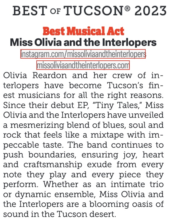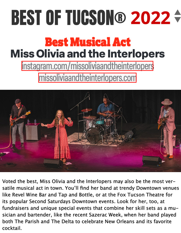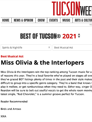 'Best Musical Act' (2021, 2022, 2023 & 2025) - Tucson Weekly Best of Tucson