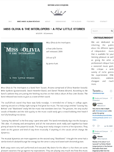 With their debut E.P. 'Tiny Tales', Miss Olivia & The Interlopers showcased a bold sound and a brilliant vision, weaving blues, soul and rock & roll – sounding for all the world like your favorite mixtape from an old friend with a great record collection.